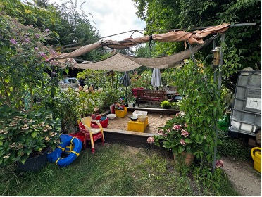 Zur Bewegungsfläche gehört der hauseigene Hof und Garten, in dem es für Ihr Kind altersgerechte Fahr- und Spielzeuge, einen großen Sandkasten, ein Trampolin, die Familienmeerschweine und Platz für selbst mitgebrachten Spielfahrzeuge gibt.